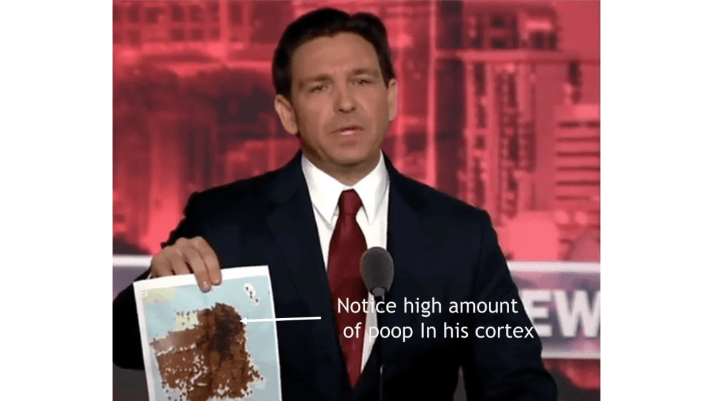 Ron DeSantis holding a picture of the poop-map of his brain.