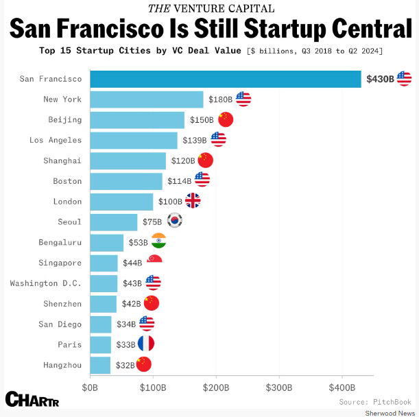 In the first half of 2025, roughly 68% of all U.S. startup funding went to California-headquartered companies. If you using the internet, ChatGPT, drive a Tesla or Lucid EV, use PowerPoint, search the web using your Apple computer, an Intel-based computer, buy products on ebay, using a computer or phone screen (quantum dots), store data using DataBricks, integrated circuits, use lithium-ion batteries, use PCR for genetic analysis, RISC computer chips, use an Intel processor, WYSIWYG software editing or Oracle software, immunotherapy for cancer (checkpoint inhibitors), you’re using technology created, or partially created, at UC Berkeley or by UC Berkeley grads. And if you’re using Google, you’re using a product developed by Stanford and Berkeley grads, and all of these technologies were developed with government funding and support. Using fiberoptics and satellite links? They are dependent on technology developed at Caltech by a Caltech grad. So is VLSI. You’ll see in the figure below that San Francisco and California are still, by far, the world’s leader in tech innovation. As always, San Francisco is the hub, and the city’s tech scene is booming, with people arriving from around the world. Let’s look at the new companies and their technologies now arising in California.